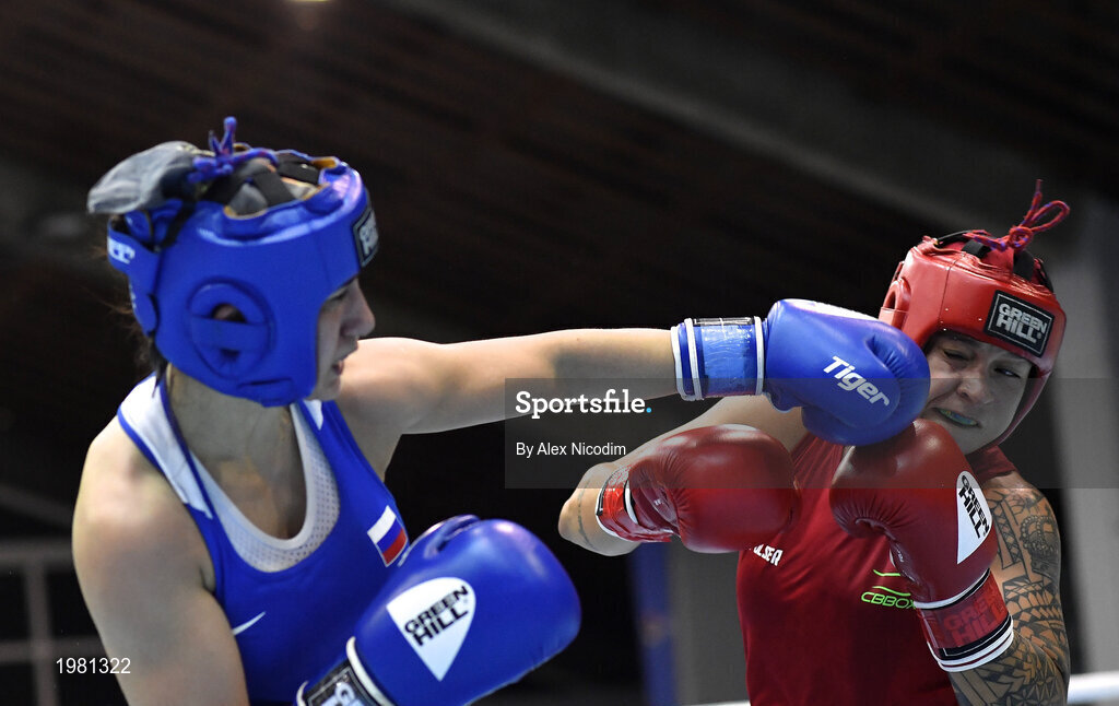 26 February 2021; Beatriz Ferreira of Brazil, right, and Nune Asatrian of Russia during their women's lightweight 60kg semi-final bout at the AIBA Strandja Memorial Boxing Tournament in Sofia, Bulgaria. Photo by Alex Nicodim/Sportsfile