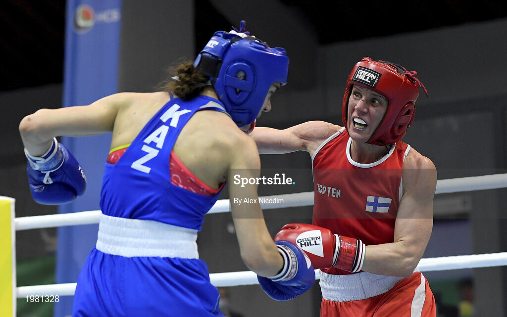 26 February 2021; Mira Potkonen of Finland, right, and Karina Ibragimova of Kazakhstan during their women's lightweight 60kg semi-final bout at the AIBA Strandja Memorial Boxing Tournament in Sofia, Bulgaria. Photo by Alex Nicodim/Sportsfile