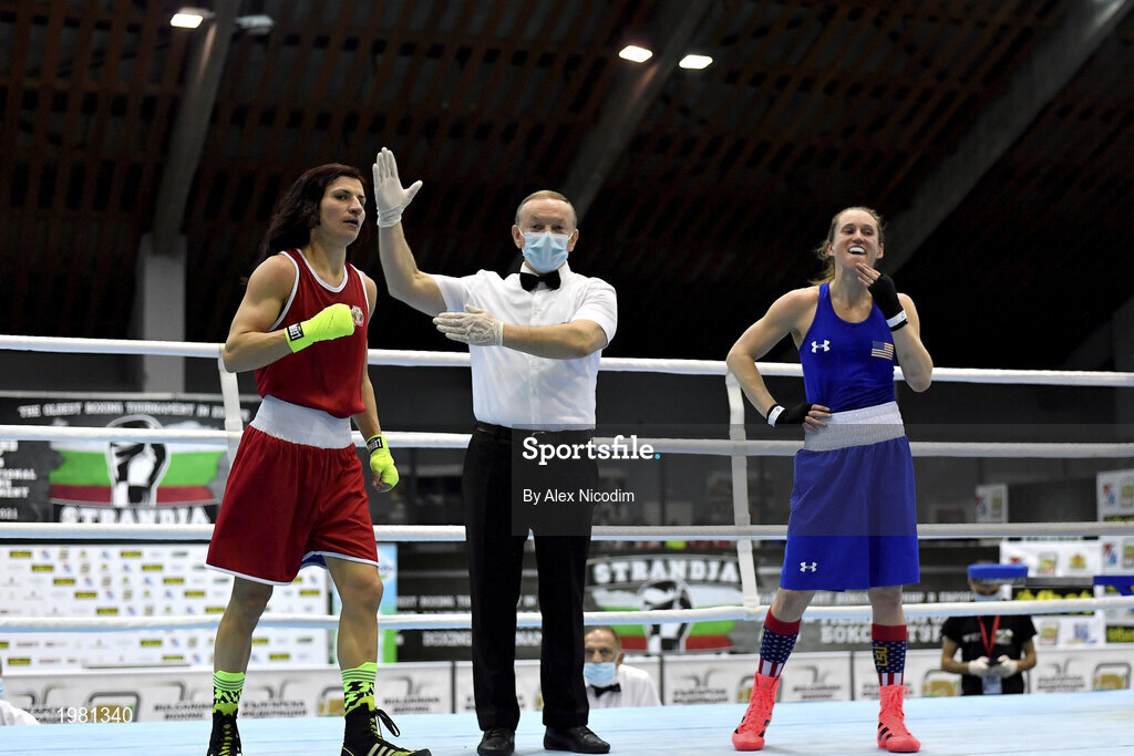26 February 2021; Virginia Fuchs of USA, right, reacts as Stoyka Krasteva of Bulgaria is declared victorious following their women's welter flyweight 51kg semi-final bout at the AIBA Strandja Memorial Boxing Tournament in Sofia, Bulgaria. Photo by Alex Nicodim/Sportsfile