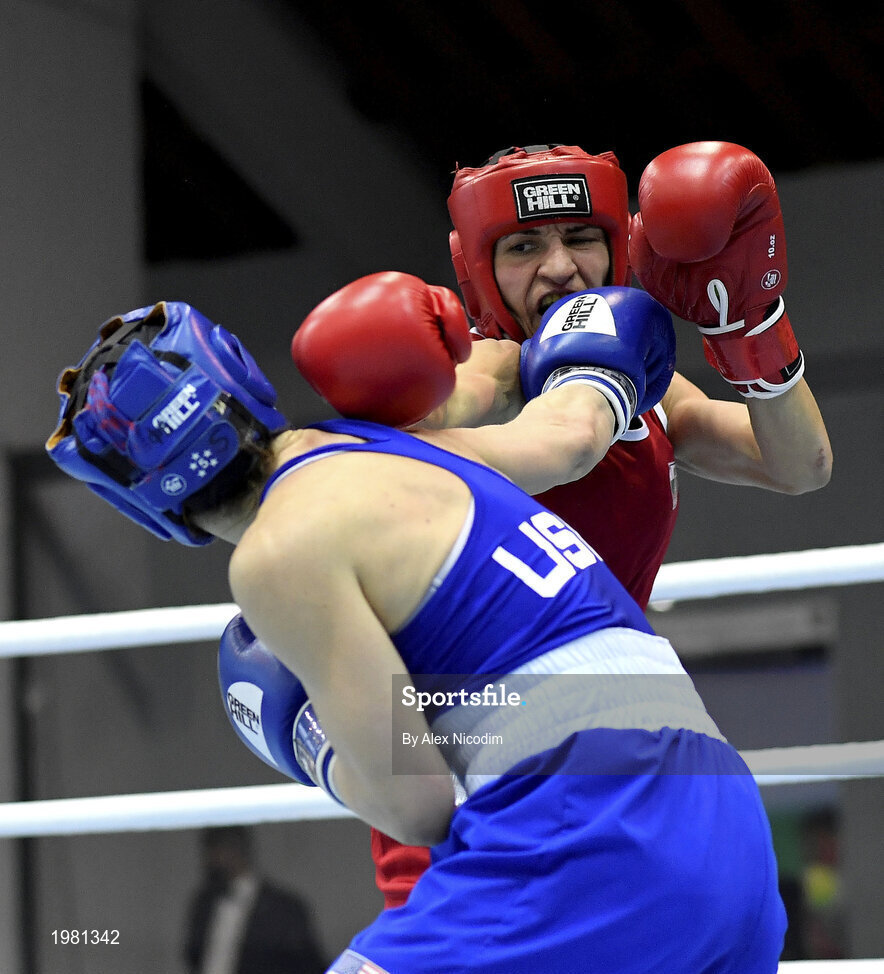 26 February 2021; Virginia Fuchs of USA, left, and Stoyka Krasteva of Bulgaria during their women's welter flyweight 51kg semi-final bout at the AIBA Strandja Memorial Boxing Tournament in Sofia, Bulgaria. Photo by Alex Nicodim/Sportsfile