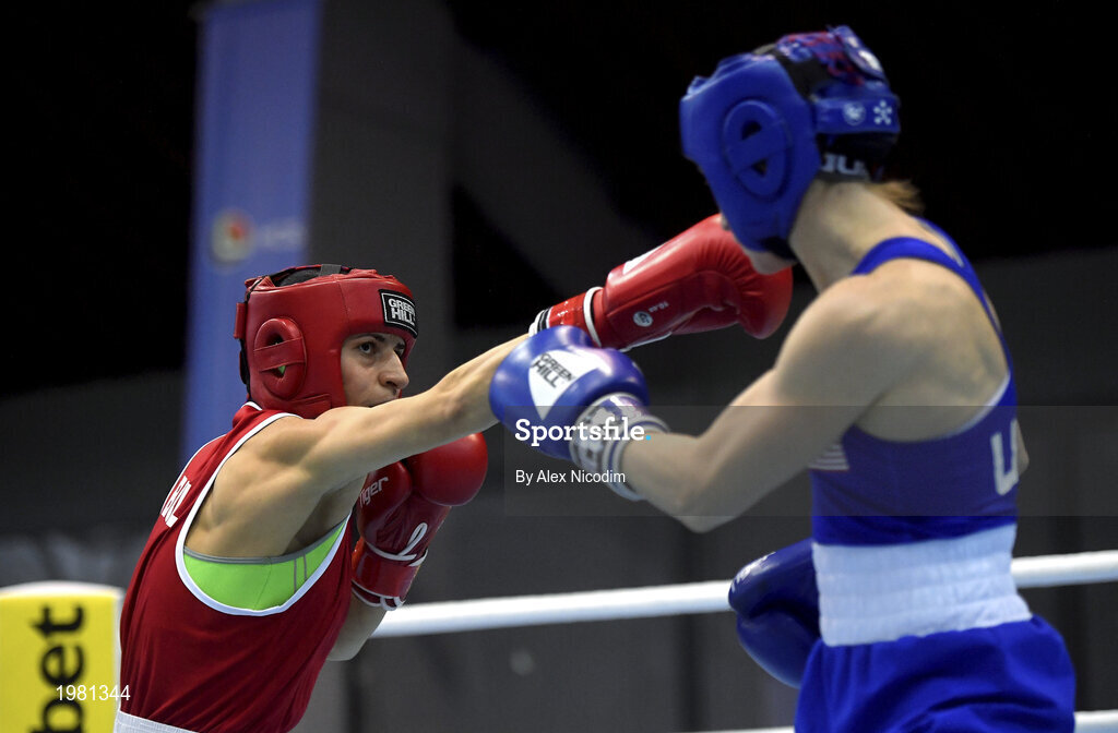 26 February 2021; Virginia Fuchs of USA, right, and Stoyka Krasteva of Bulgaria during their women's welter flyweight 51kg semi-final bout at the AIBA Strandja Memorial Boxing Tournament in Sofia, Bulgaria. Photo by Alex Nicodim/Sportsfile