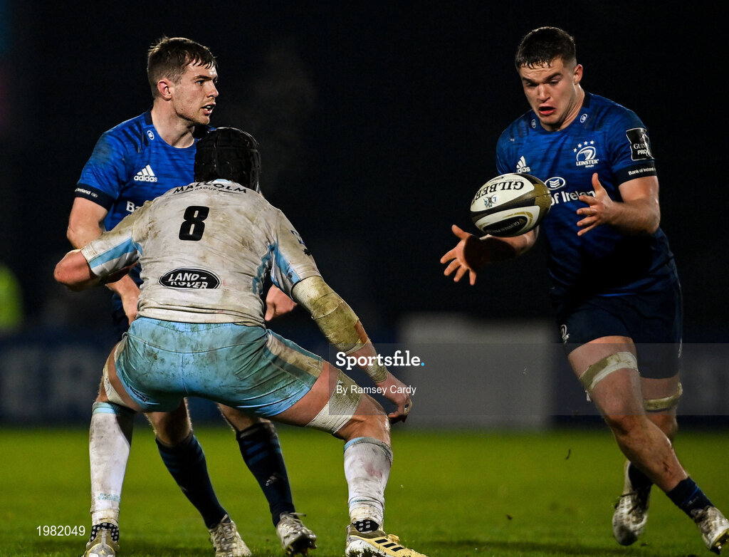 28 February 2021; Luke McGrath of Leinster passes to Scott Penny, right, during the Guinness PRO14 match between Leinster and Glasgow Warriors at the RDS Arena in Dublin. Photo by Ramsey Cardy/Sportsfile