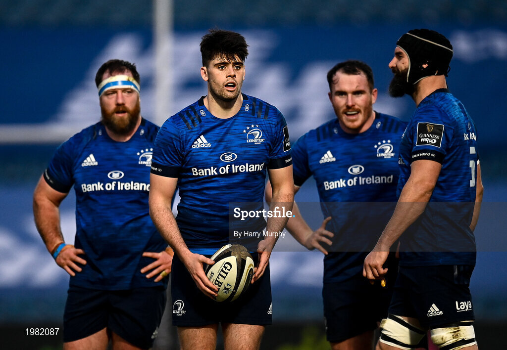 28 February 2021; Harry Byrne of Leinster, with, from left, Michael Bent, Peter Dooley and Scott Fardy during the Guinness PRO14 match between Leinster and Glasgow Warriors at the RDS Arena in Dublin. Photo by Harry Murphy/Sportsfile