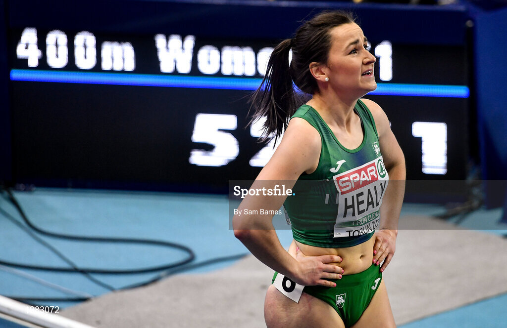 5 March 2021; Phil Healy of Ireland after winning her semi-final of the Women's 400m during the second session on day one of the European Indoor Athletics Championships at Arena Torun in Torun, Poland. Photo by Sam Barnes/Sportsfile