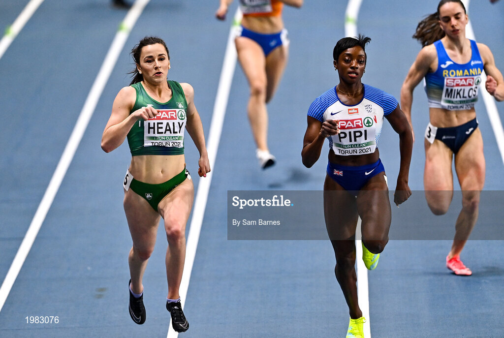 5 March 2021; Phil Healy of Ireland, left, leads Amarachi Pipi of Great Britain in their semi-final of the Women's 400m during the second session on day one of the European Indoor Athletics Championships at Arena Torun in Torun, Poland. Photo by Sam Barnes/Sportsfile