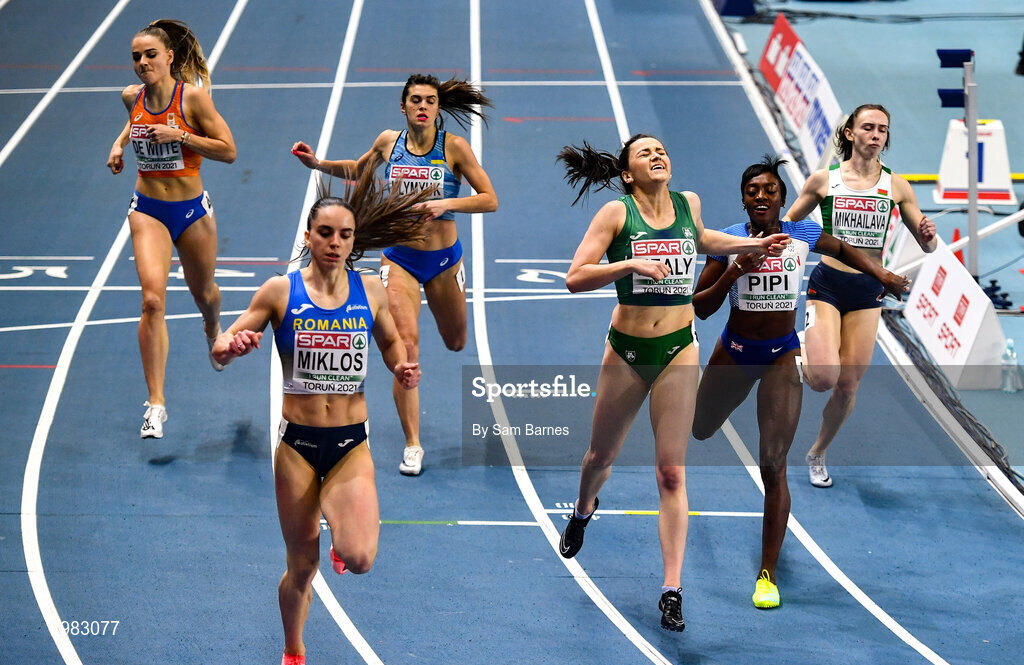 5 March 2021; Phil Healy of Ireland, fourth from left, wins her semi-final of the Women's 400m from Andrea Miklos of Romania, left, and Amarachi Pipi of Great Britain during the second session on day one of the European Indoor Athletics Championships at Arena Torun in Torun, Poland. Photo by Sam Barnes/Sportsfile