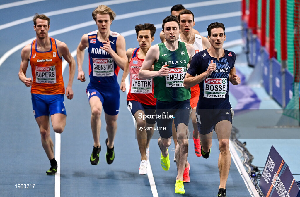5 March 2021; Mark English of Ireland, centre, and Pierre-Ambroise Bosse of France lead the field in the Men's 800m qualifying round during the second session on day one of the European Indoor Athletics Championships at Arena Torun in Torun, Poland. Photo by Sam Barnes/Sportsfile