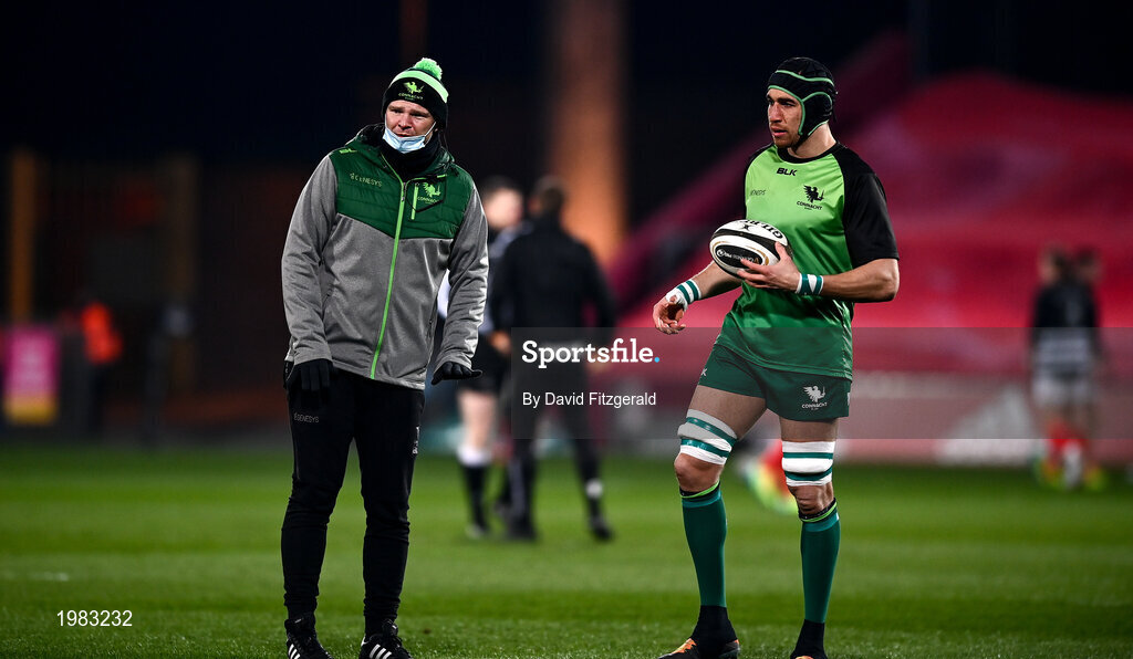 5 March 2021; Connacht defence coach Peter Wilkins with Ultan Dillane prior to the Guinness PRO14 match between Munster and Connacht at Thomond Park in Limerick. Photo by David Fitzgerald/Sportsfile
