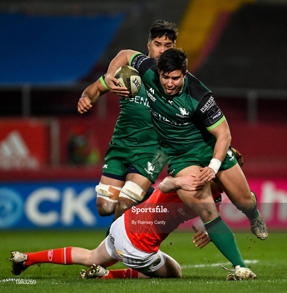5 March 2021; Dave Heffernan of Connacht is tackled by Ben Healy of Munster during the Guinness PRO14 match between Munster and Connacht at Thomond Park in Limerick. Photo by Ramsey Cardy/Sportsfile