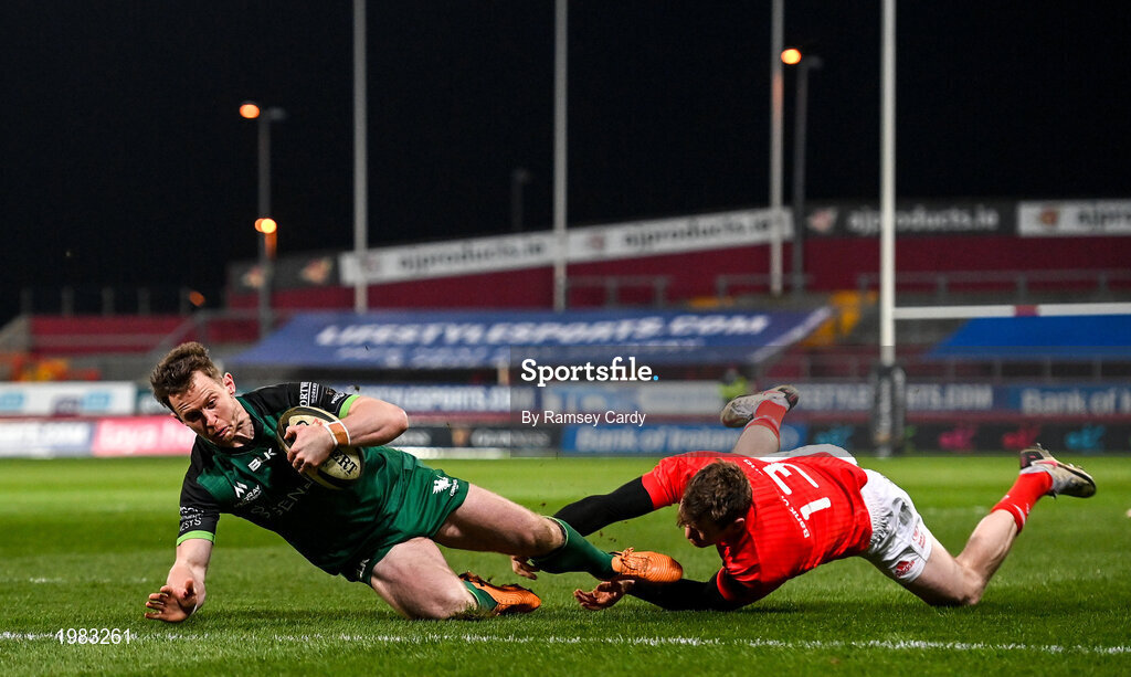 5 March 2021; Matt Healy of Connacht scores his side's first try despite the tackle of Chris Farrell of Munster during the Guinness PRO14 match between Munster and Connacht at Thomond Park in Limerick. Photo by Ramsey Cardy/Sportsfile