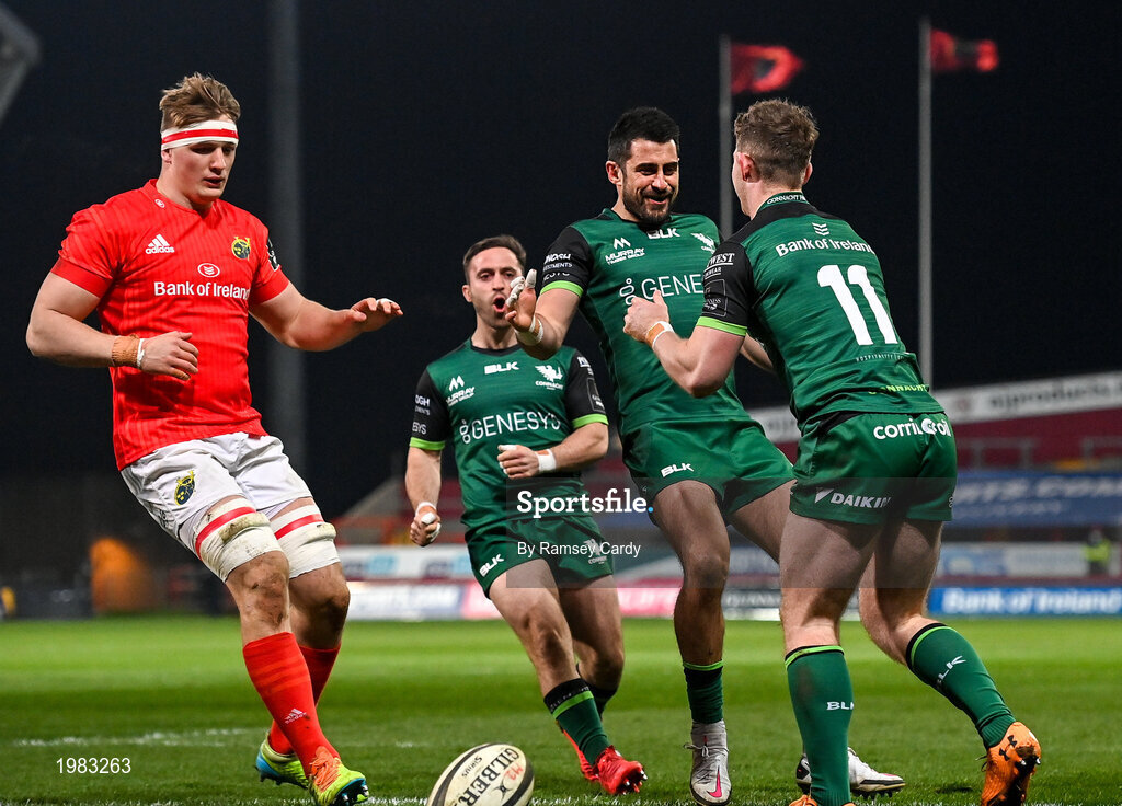 5 March 2021; Matt Healy of Connacht celebrates with Connacht team-mates Caolin Blade, left, and Tiernan O'Halloran after scoring his side's first try during the Guinness PRO14 match between Munster and Connacht at Thomond Park in Limerick. Photo by Ramsey Cardy/Sportsfile