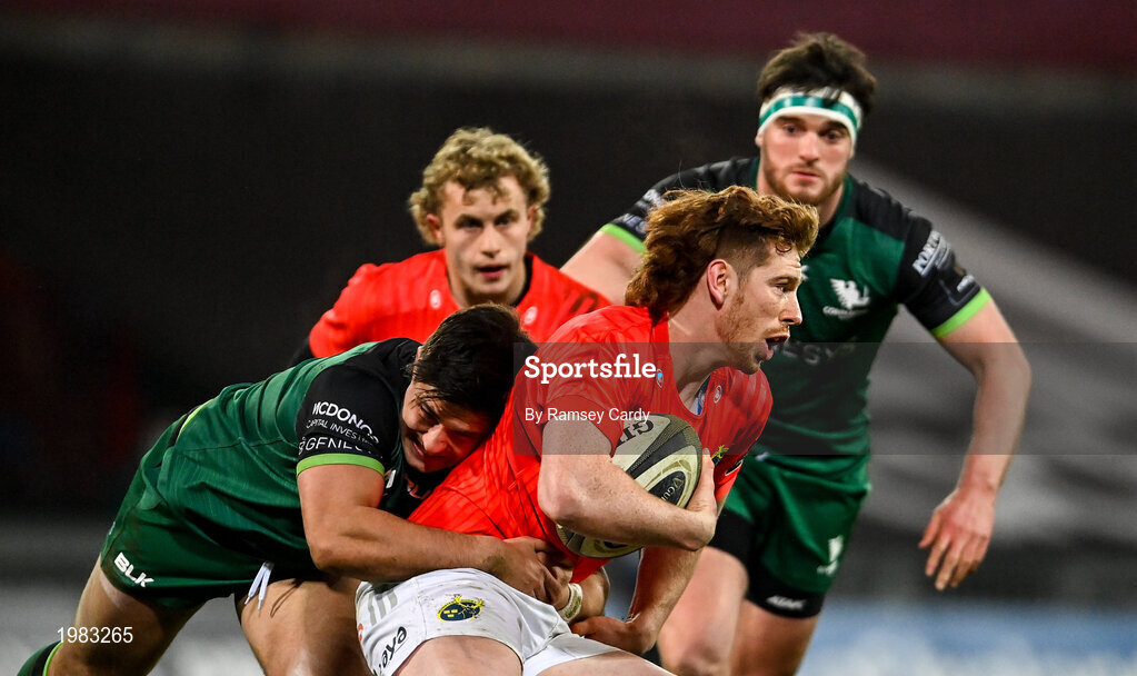 5 March 2021; Ben Healy of Munster is tackled by Dave Heffernan of Connacht during the Guinness PRO14 match between Munster and Connacht at Thomond Park in Limerick. Photo by Ramsey Cardy/Sportsfile