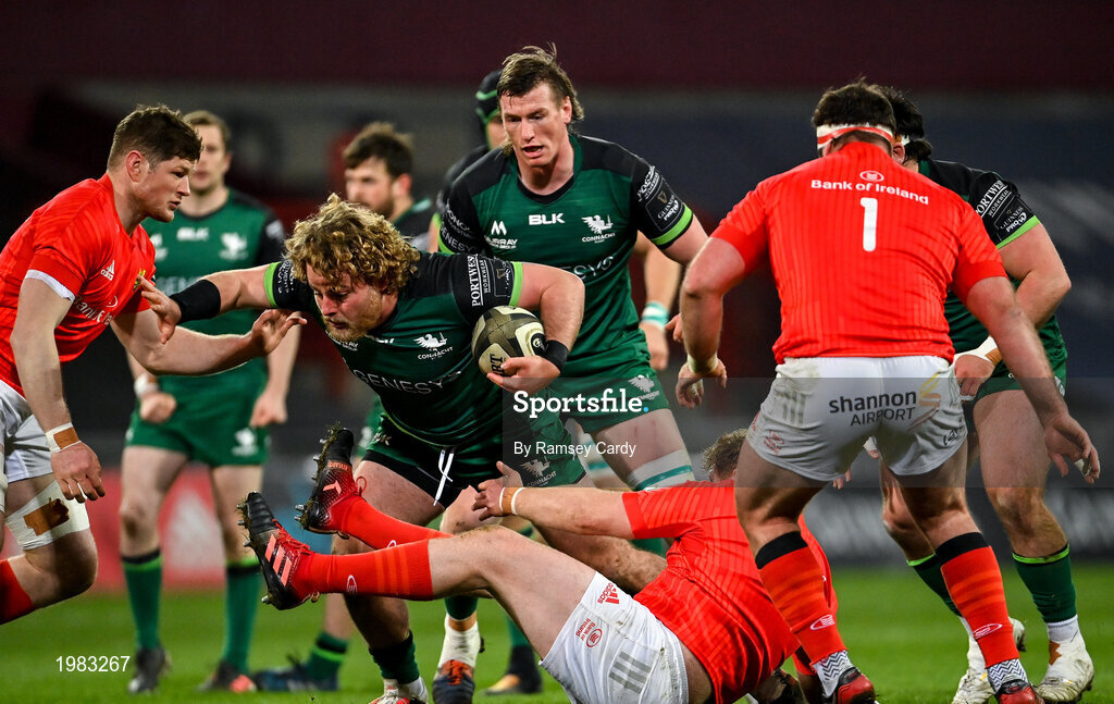 5 March 2021; Finlay Bealham of Connacht in action against Jack O'Donoghue of Munster during the Guinness PRO14 match between Munster and Connacht at Thomond Park in Limerick. Photo by Ramsey Cardy/Sportsfile