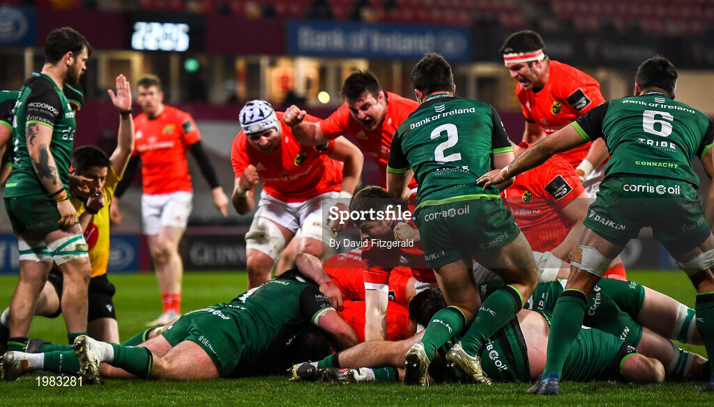 5 March 2021; James Cronin of Munster (hidden) scores his side's first try during the Guinness PRO14 match between Munster and Connacht at Thomond Park in Limerick. Photo by David Fitzgerald/Sportsfile