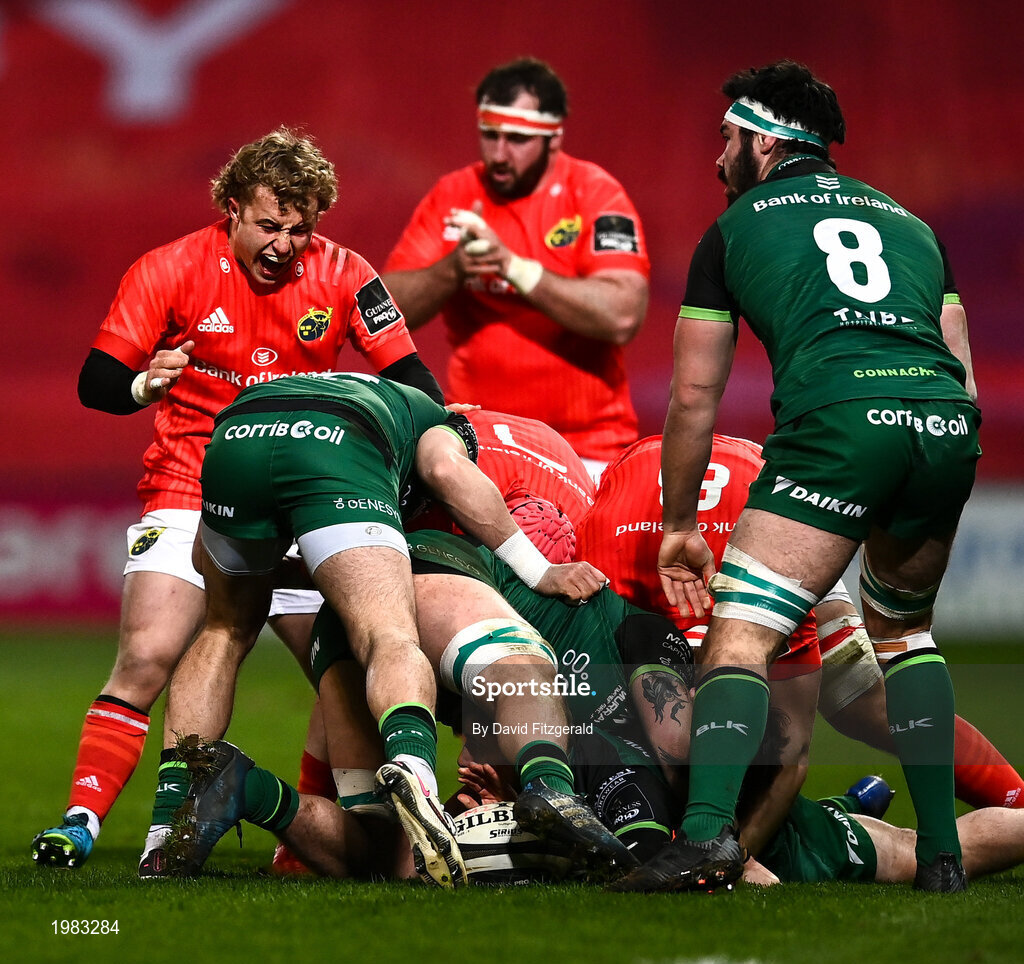 5 March 2021; Craig Casey of Munster celebrates a turnover during the Guinness PRO14 match between Munster and Connacht at Thomond Park in Limerick. Photo by David Fitzgerald/Sportsfile