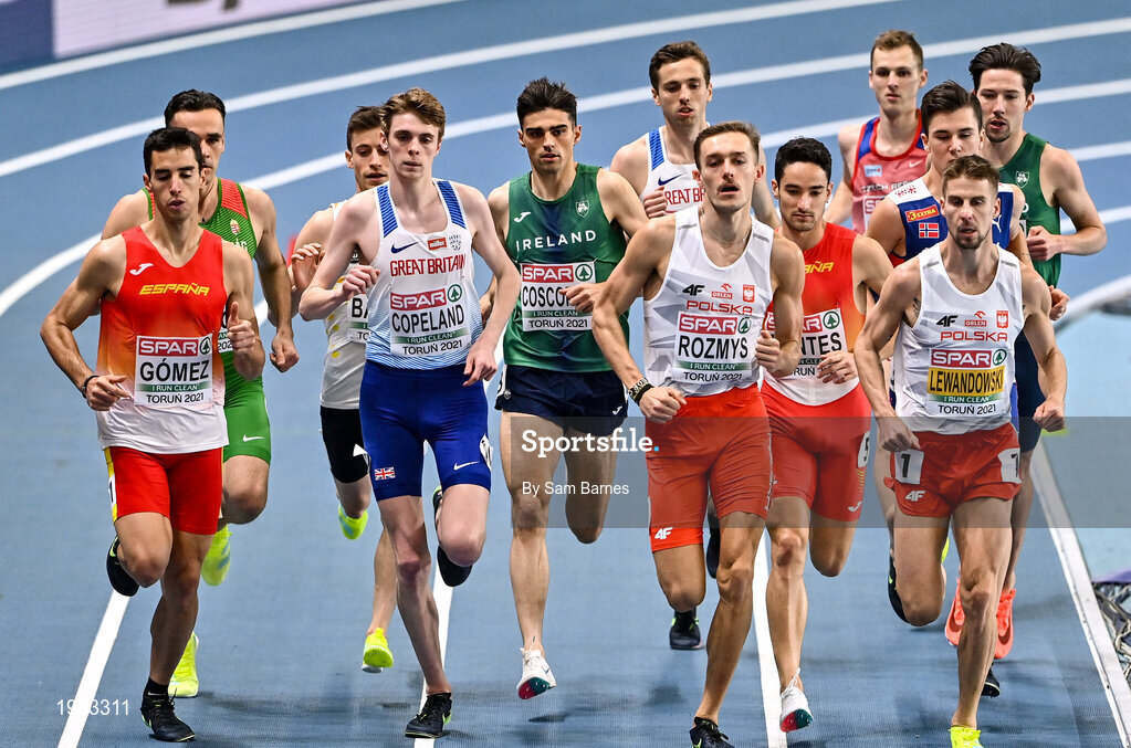 5 March 2021; Andrew Coscoran of Ireland, centre, competes in the Men's 1500m final during the second session on day one of the European Indoor Athletics Championships at Arena Torun in Torun, Poland. Photo by Sam Barnes/Sportsfile