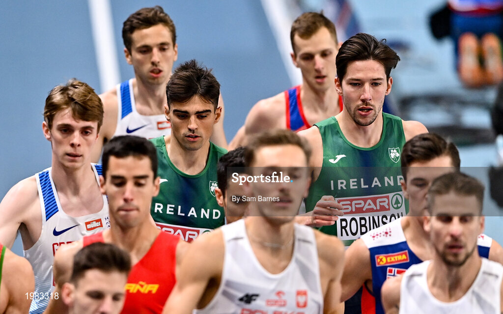 5 March 2021; Andrew Coscoran and Paul Robinson of Ireland competing in the Men's 1500m final during the second session on day one of the European Indoor Athletics Championships at Arena Torun in Torun, Poland. Photo by Sam Barnes/Sportsfile