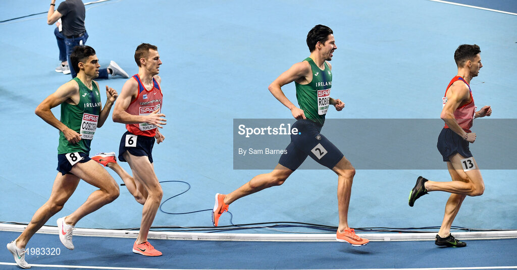 5 March 2021; Andrew Coscoran, left, and Paul Robinson of Ireland competing in the Men's 1500m final during the second session on day one of the European Indoor Athletics Championships at Arena Torun in Torun, Poland. Photo by Sam Barnes/Sportsfile