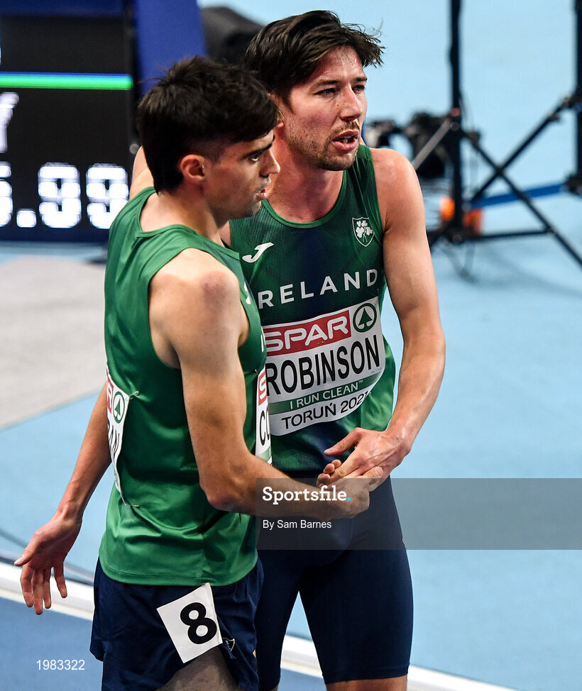 5 March 2021; Andrew Coscoran and Paul Robinson of Ireland after the Men's 1500m final during the second session on day one of the European Indoor Athletics Championships at Arena Torun in Torun, Poland. Photo by Sam Barnes/Sportsfile