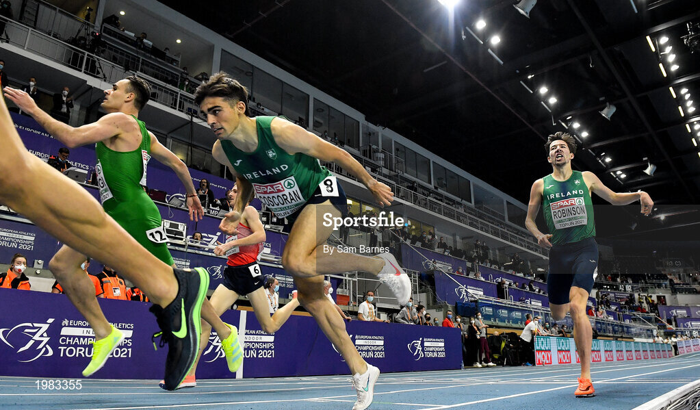 5 March 2021; Andrew Coscoran and Paul Robinson of Ireland cross the line in the Men's 1500m final during the second session on day one of the European Indoor Athletics Championships at Arena Torun in Torun, Poland. Photo by Sam Barnes/Sportsfile