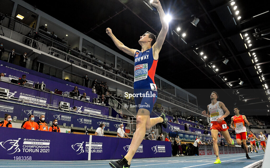 5 March 2021; Jakob Ingebrigtsen of Norway, later disqualified and subsequently reinstated on appeal, celebrates winning the Men's 1500m final from Marcin Lewandowski of Poland during the second session on day one of the European Indoor Athletics Championships at Arena Torun in Torun, Poland. Photo by Sam Barnes/Sportsfile
