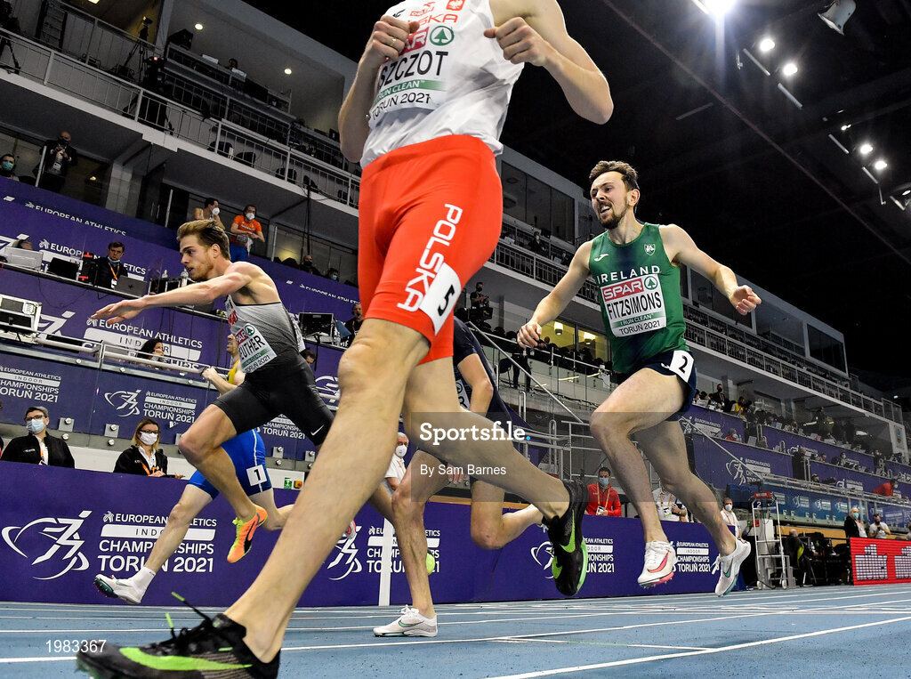 5 March 2021; Marc Reuther of Germany, and John Fitzsimons of Ireland cross the finish line behind Adam Kszczot of Poland in their heat of the Men's 800m during the second session on day one of the European Indoor Athletics Championships at Arena Torun in Torun, Poland. Photo by Sam Barnes/Sportsfile