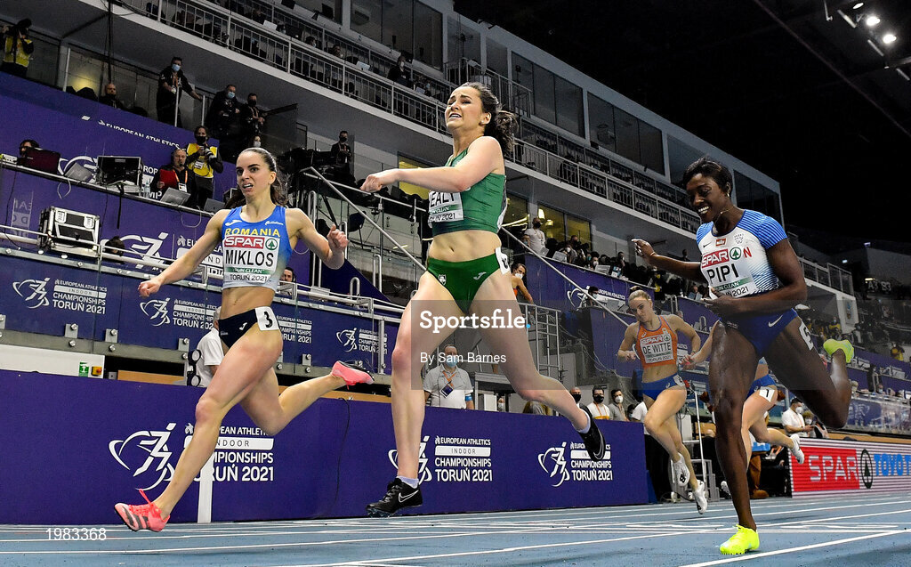 5 March 2021; Phil Healy of Ireland wins her semi-final of the Women's 400m from Andrea Miklos of Romania, left, and Amarachi Pipi of Great Britain during the second session on day one of the European Indoor Athletics Championships at Arena Torun in Torun, Poland. Photo by Sam Barnes/Sportsfile