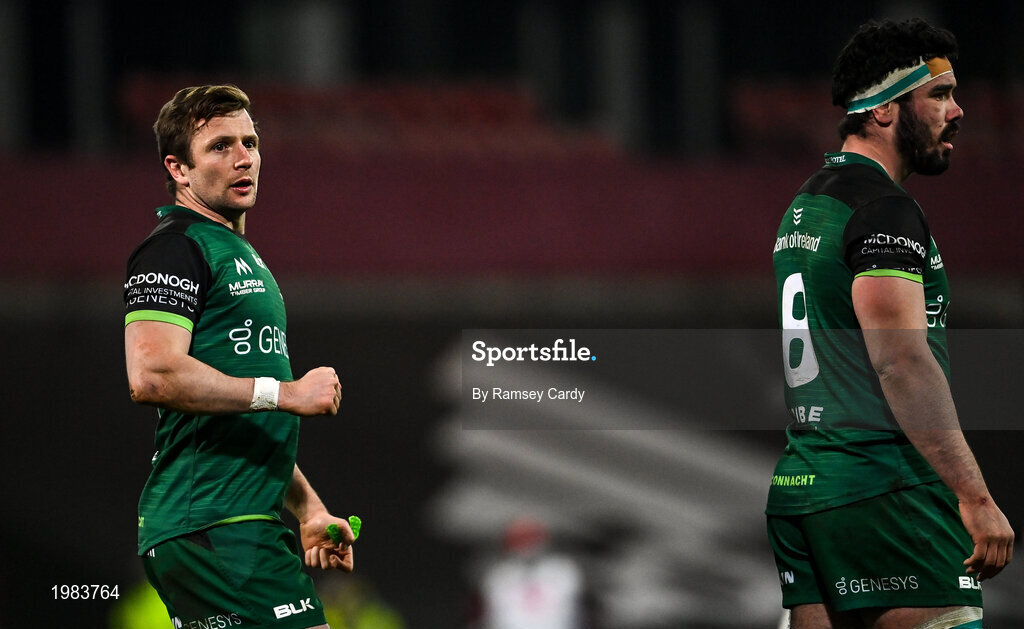 5 March 2021; Jack Carty, left, and Paul Boyle of Connacht during the Guinness PRO14 match between Munster and Connacht at Thomond Park in Limerick. Photo by Ramsey Cardy/Sportsfile