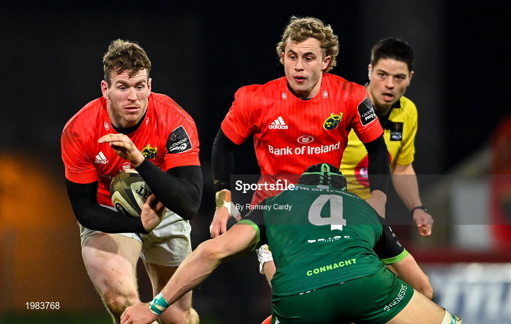 5 March 2021; Chris Farrell of Munster is tackled by Ultan Dillane of Connacht during the Guinness PRO14 match between Munster and Connacht at Thomond Park in Limerick. Photo by Ramsey Cardy/Sportsfile