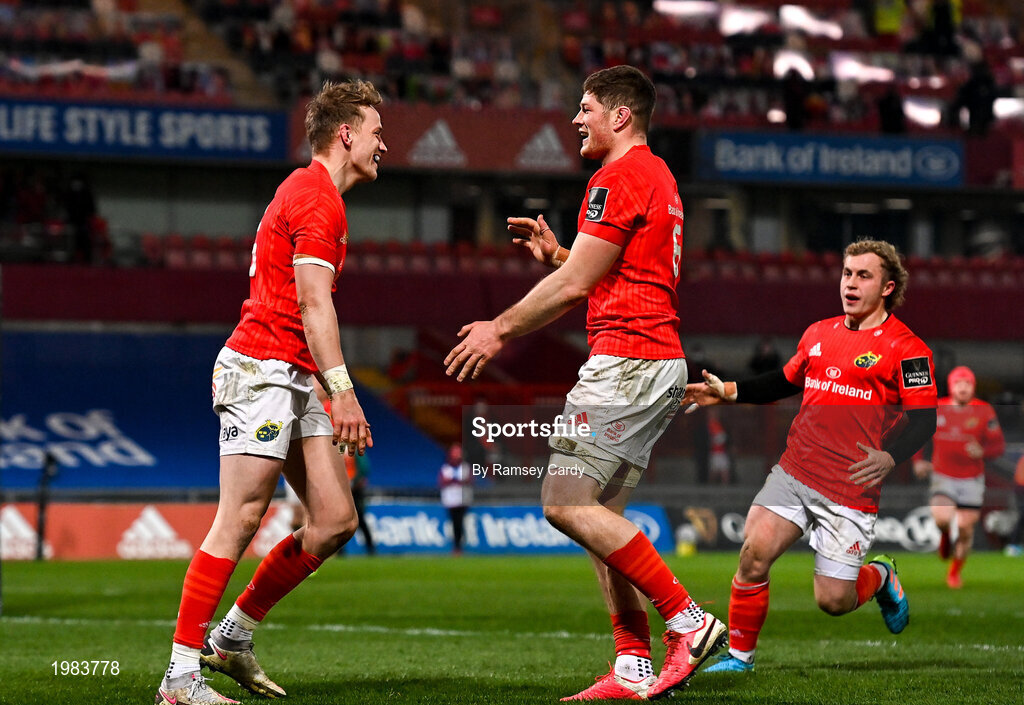 5 March 2021; Mike Haley, left, celebrates with Munster team-mates Jack O'Donoghue and Craig Casey after scoring his side's second try during the Guinness PRO14 match between Munster and Connacht at Thomond Park in Limerick. Photo by Ramsey Cardy/Sportsfile