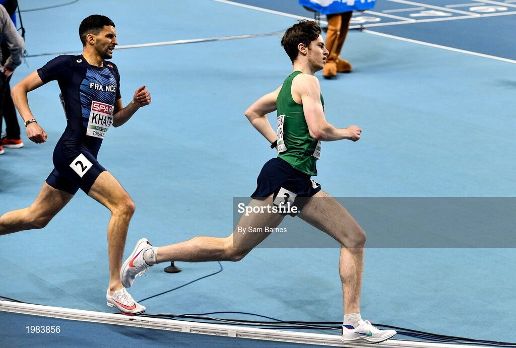 6 March 2021; Cian McPhillips of Ireland leads Nasredine Khatir of France in the Men's 800m semi-final during the second session on day two of the European Indoor Athletics Championships at Arena Torun in Torun, Poland. Photo by Sam Barnes/Sportsfile