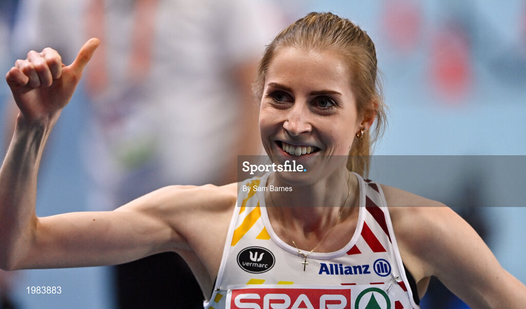 6 March 2021; Elise Vanderelst of Belgium celebrates winning gold in the Women's 1500m final during the second session on day two of the European Indoor Athletics Championships at Arena Torun in Torun, Poland. Photo by Sam Barnes/Sportsfile