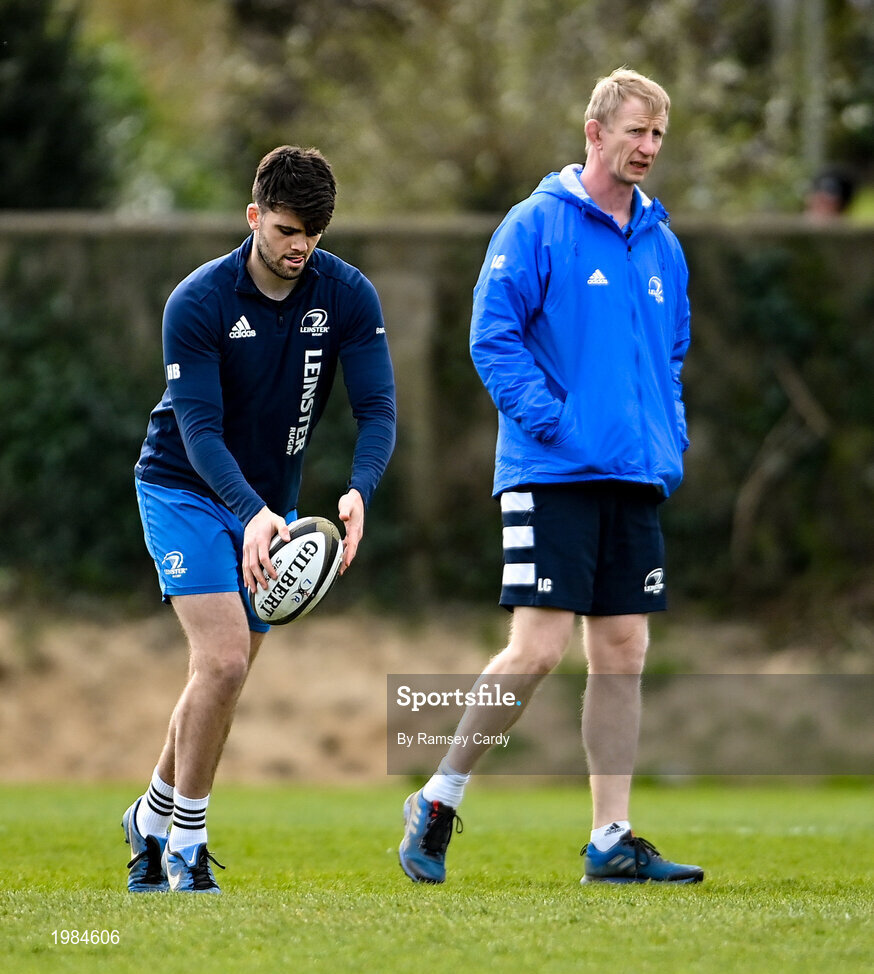 8 March 2021; Harry Byrne, watched by head coach Leo Cullen during Leinster Rugby squad training at UCD in Dublin. Photo by Ramsey Cardy/Sportsfile