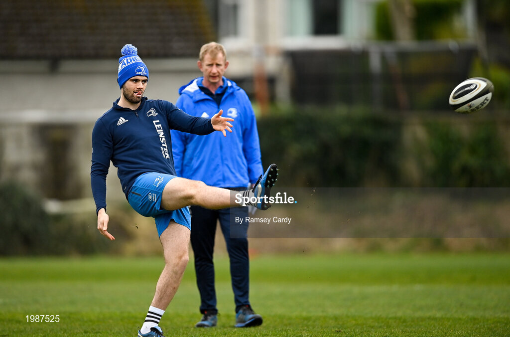 15 March 2021; Harry Byrne, watched by head coach Leo Cullen, during Leinster Rugby Squad Training at UCD in Dublin. Photo by Ramsey Cardy/Sportsfile