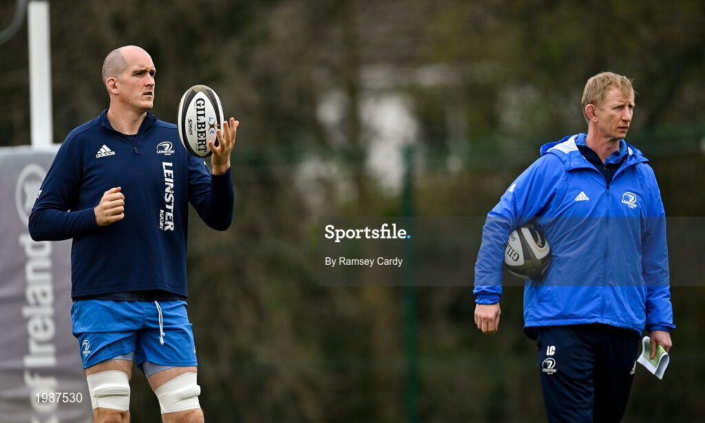 15 March 2021; Devin Toner, left, and head coach Leo Cullen during Leinster Rugby Squad Training at UCD in Dublin. Photo by Ramsey Cardy/Sportsfile