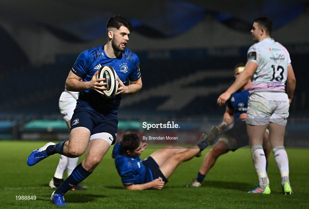 19 March 2021; Harry Byrne of Leinster runs through to score his side's first try during the Guinness PRO14 match between Leinster and Ospreys at RDS Arena in Dublin. Photo by Brendan Moran/Sportsfile