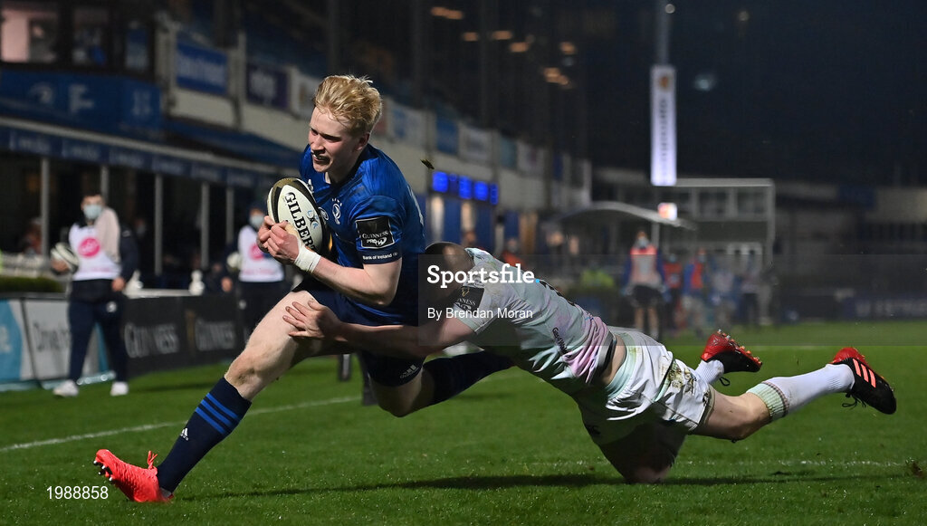 19 March 2021; Jamie Osborne of Leinster breaks past the tackle of Luke Price of Ospreys on the way to scoring his side's second try during the Guinness PRO14 match between Leinster and Ospreys at RDS Arena in Dublin. Photo by Brendan Moran/Sportsfile