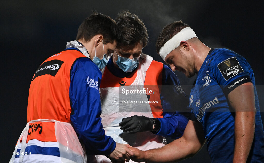19 March 2021; Scott Penny of Leinster receives medical attention for an injury during the Guinness PRO14 match between Leinster and Ospreys at RDS Arena in Dublin. Photo by Piaras Ó Mídheach/Sportsfile