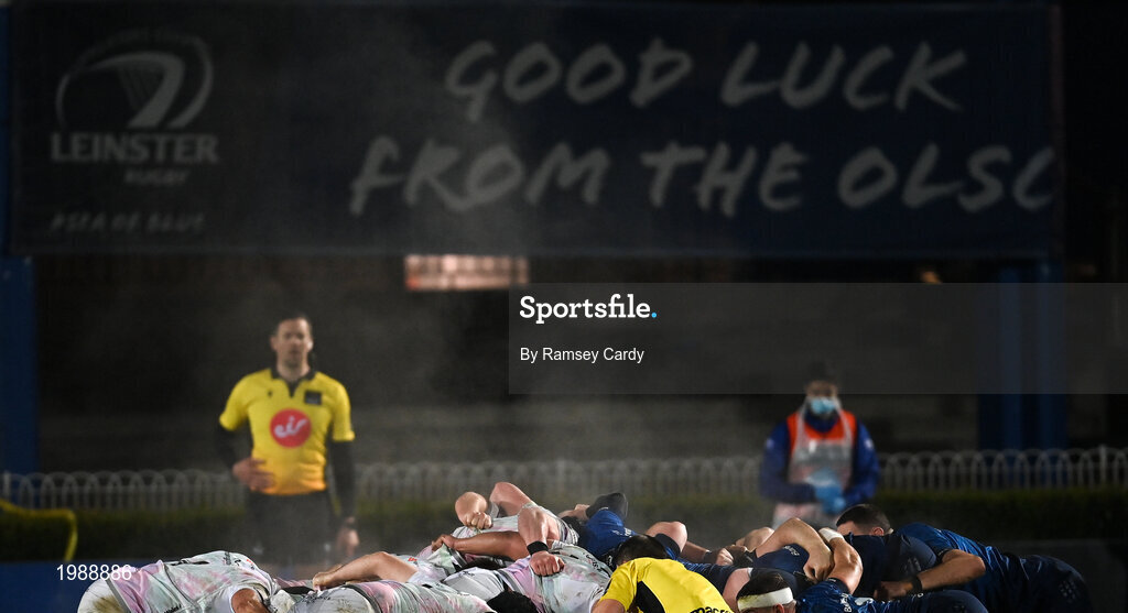 19 March 2021; A general view of a scrum during the Guinness PRO14 match between Leinster and Ospreys at RDS Arena in Dublin. Photo by Ramsey Cardy/Sportsfile