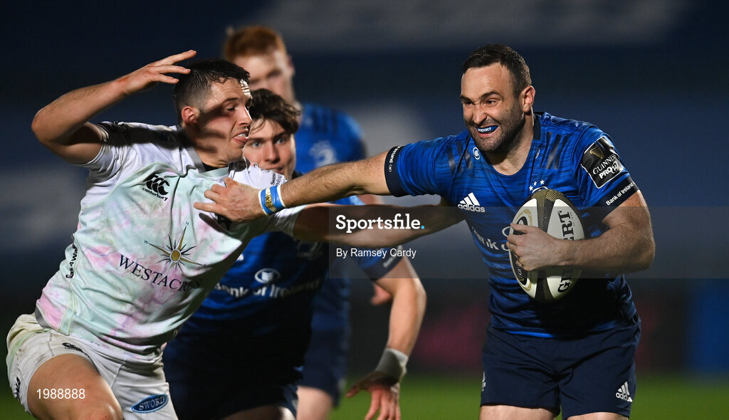 19 March 2021; Dave Kearney of Leinster is tackled by Owen Watkin of Ospreys during the Guinness PRO14 match between Leinster and Ospreys at RDS Arena in Dublin. Photo by Ramsey Cardy/Sportsfile
