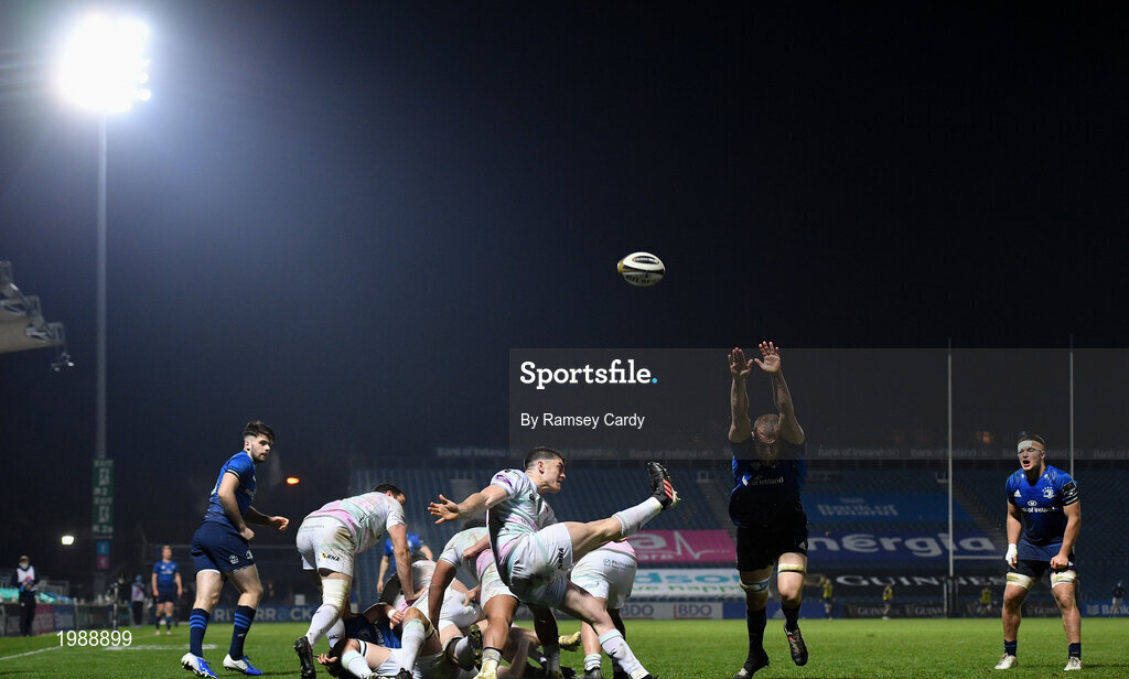 19 March 2021; Reuben Morgan-Williams of Ospreys clears under pressure from Ross Molony of Leinster during the Guinness PRO14 match between Leinster and Ospreys at RDS Arena in Dublin. Photo by Ramsey Cardy/Sportsfile
