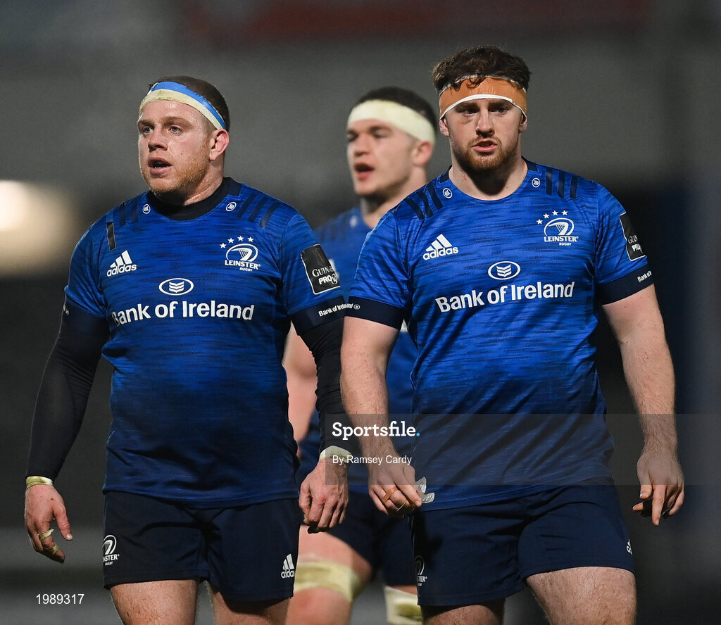 19 March 2021; Seán Cronin, left, and Marcus Hanan of Leinster during the Guinness PRO14 match between Leinster and Ospreys at RDS Arena in Dublin. Photo by Ramsey Cardy/Sportsfile