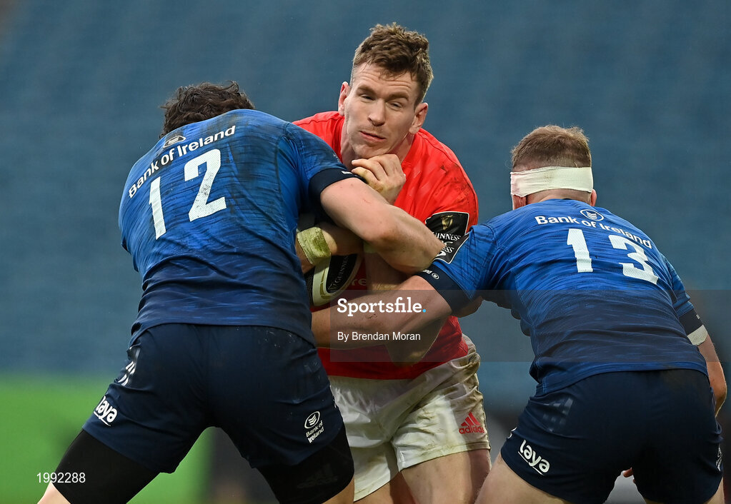 27 March 2021; Chris Farrell of Munster is tackled by Robbie Henshaw and Rory O'Loughlin of Leinster during the Guinness PRO14 Final match between Leinster and Munster at the RDS Arena in Dublin. Photo by Brendan Moran/Sportsfile