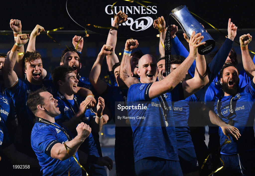 27 March 2021; Devin Toner of Leinster lifts the PRO14 trophy alongside his team-mates after the Guinness PRO14 Final match between Leinster and Munster at the RDS Arena in Dublin. Photo by Ramsey Cardy/Sportsfile