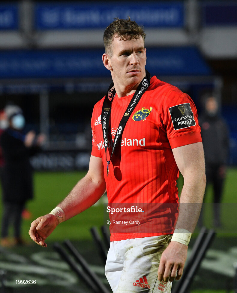 27 March 2021; Chris Farrell of Munster with his runners-up medal following his side's defeat in the Guinness PRO14 Final match between Leinster and Munster at the RDS Arena in Dublin. Photo by Ramsey Cardy/Sportsfile