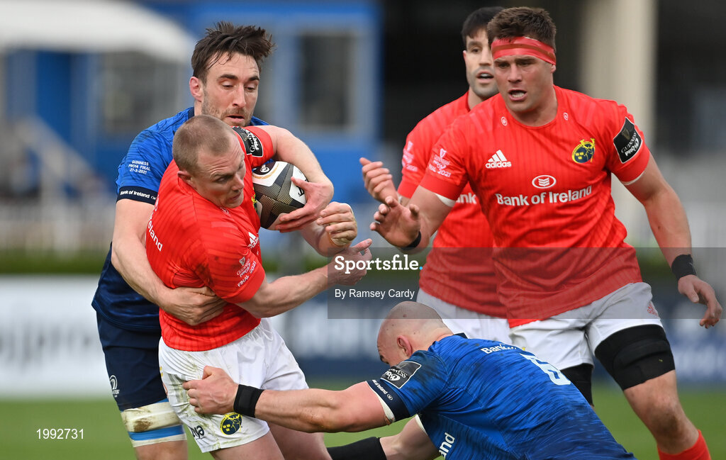 27 March 2021; Keith Earls of Munster is tackled by Jack Conan and Rhys Ruddock, right, of Leinster during the Guinness PRO14 Final match between Leinster and Munster at the RDS Arena in Dublin. Photo by Ramsey Cardy/Sportsfile