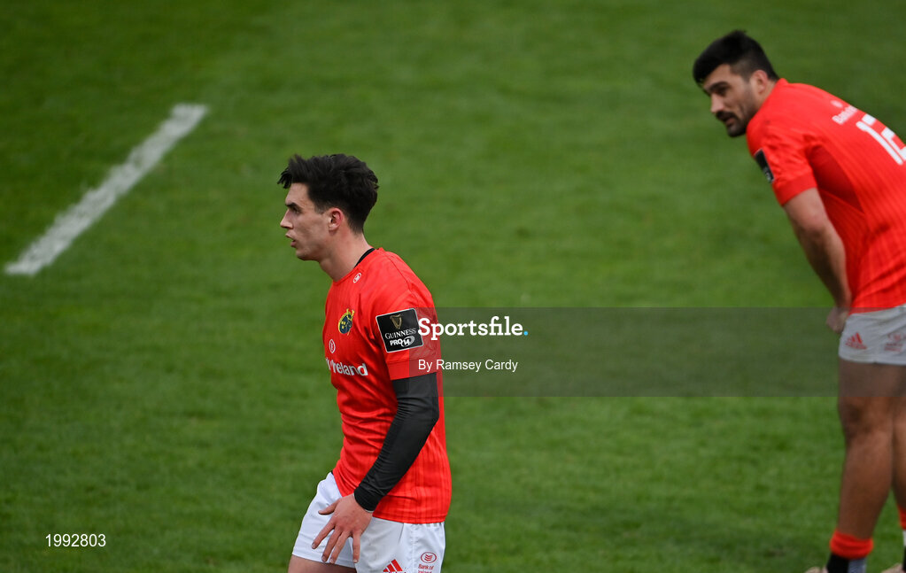 27 March 2021; Joey Carbery, left, and Damian de Allende of Munster during the Guinness PRO14 Final match between Leinster and Munster at the RDS Arena in Dublin. Photo by Ramsey Cardy/Sportsfile