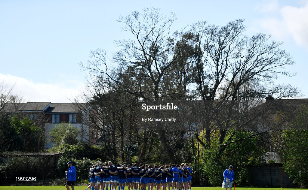 29 March 2021; The Leinster squad huddle during squad training at UCD in Dublin. Photo by Ramsey Cardy/Sportsfile