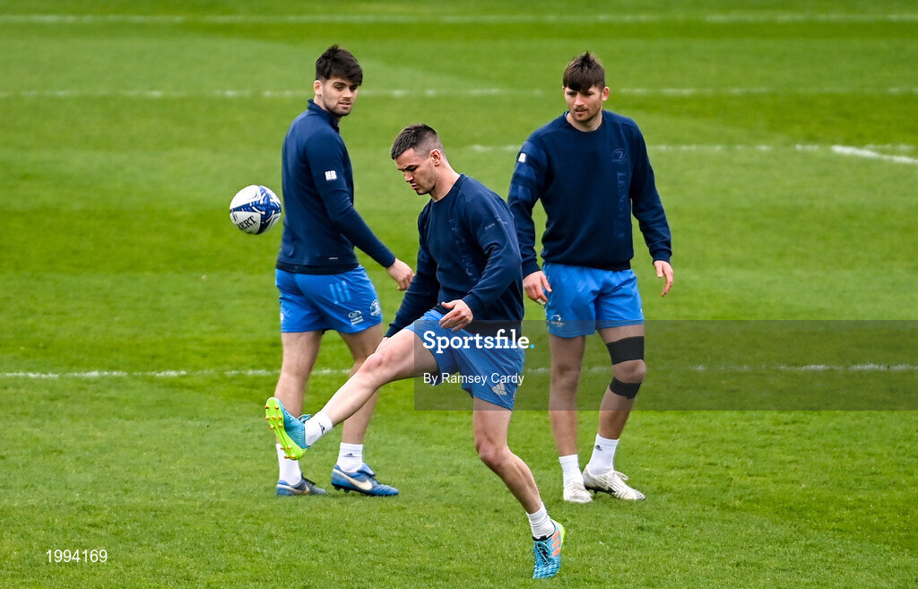 1 April 2021; Jonathan Sexton, centre, watched by Harry Byrne, left, and Ross Byrne during the Leinster Rugby captains run at the RDS Arena in Dublin. Photo by Ramsey Cardy/Sportsfile