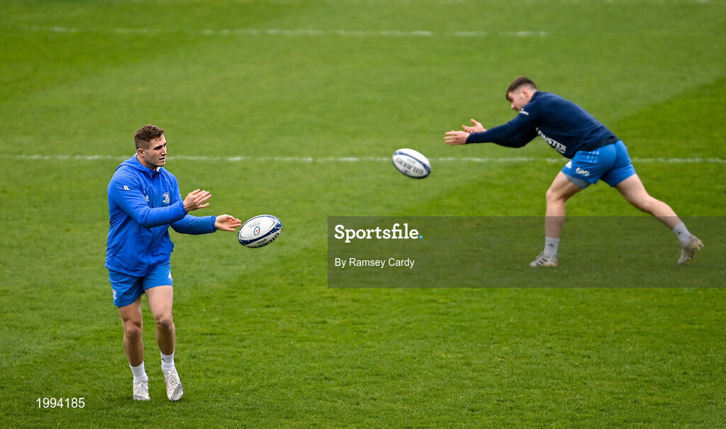 1 April 2021; Jordan Larmour, left, and Luke McGrath during the Leinster Rugby captains run at the RDS Arena in Dublin. Photo by Ramsey Cardy/Sportsfile